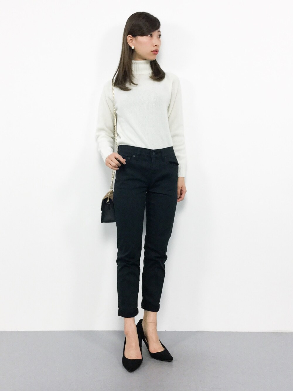 シンプルコーデ◎ タートルネックのニットは身体に フィットしますが伸縮性がしっかりあるので 窮屈感はありません♩ パンツは柔らかな生地で伸縮性ばっちり♩ オススメの1本です(^_^)☆