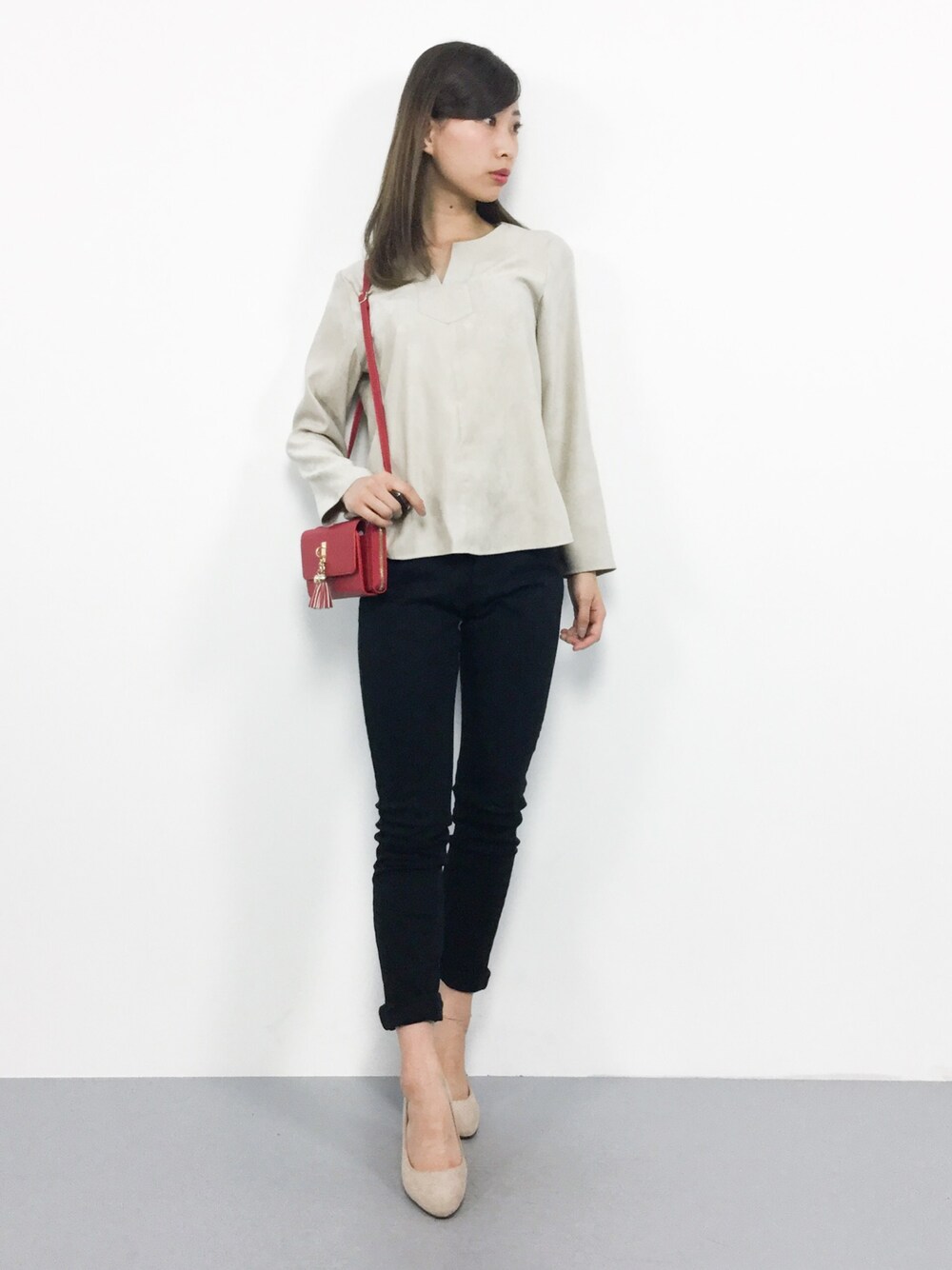 キレイめカジュアルコーデ◎ オンオフに着回しが効くスエードブラウスは 様々なシーンで活躍間違いなし♪ シンプルなスキニーパンツは トップスを選ばずに穿けるので、 使いやすいアイテムです(^_^)☆