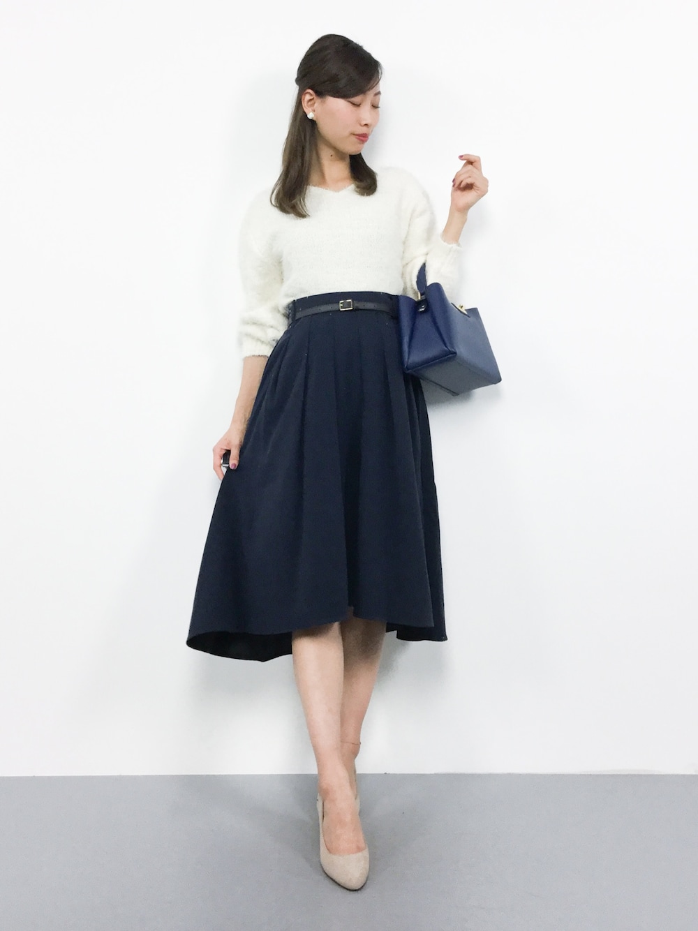 カジュアルガーリーコーデ◎ もちもちした生地のニットは柔らかく 着心地ばっちり(^_^)☆ 柔らかな生地のフレアスカートは歩くたびに裾が 揺れてとっても可愛らしくフェミニン♪