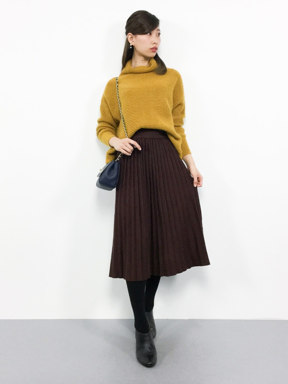 ブラウンコーデ◎ ゆったりシルエットのニットは ボトムスを選ばずに着られるので 合わせやすいですよ★ ニットのプリーツスカートは柔らかな生地で 幅広いシーズン使える優秀アイテム♪