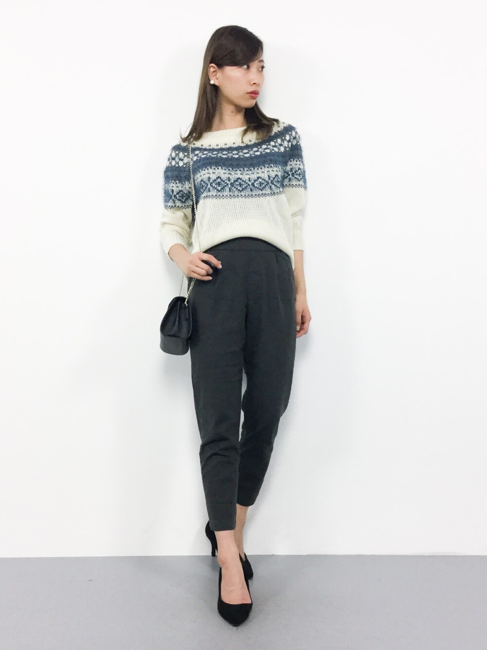カジュアルコーデ◎ ゆったりシルエットのノルディック柄ニットは ボトムスを選ばずに着られるので 合わせやすいですよ★ パンツはスッキリシルエットですが 細すぎないので穿きやすいですよ♩