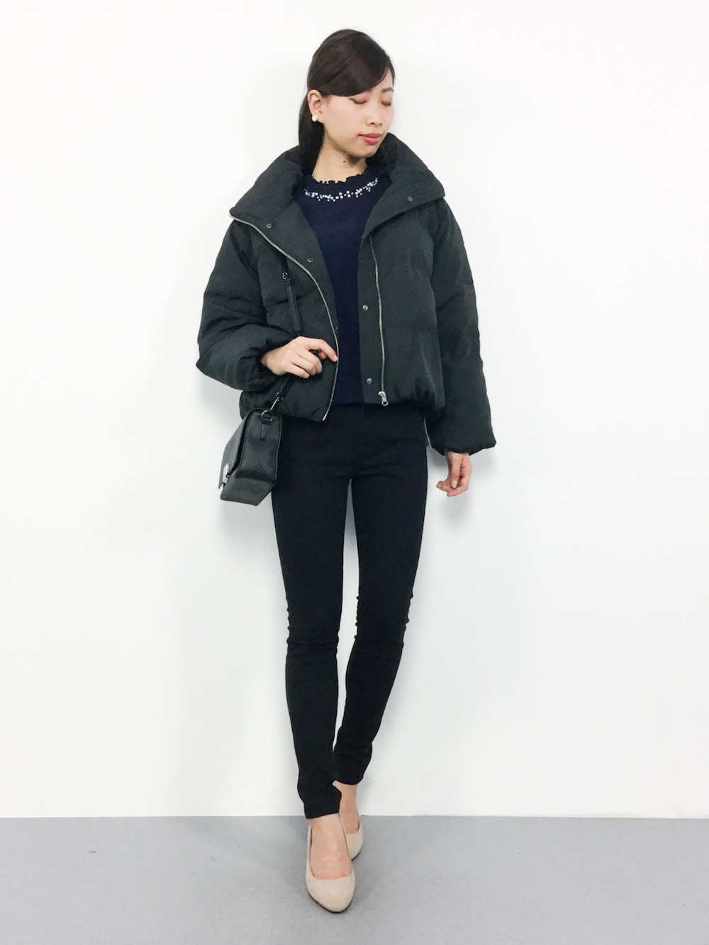 大人シンプルコーデ◎ 軽くて暖かいダウンコートは ゆったりしたデザインですが スッキリまとまるシルエットですよ(^O^) デイリーに着回しが効くビジューニットは 様々なシーンで活躍間違いなし♪