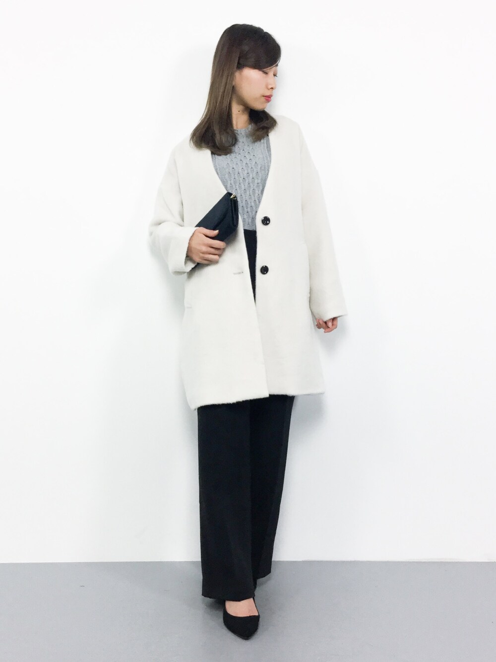 KIIのノーカラージャケット「美ラインシルエット★シャギー起毛素材ポケット付き長袖ノーカラーコート」を使ったコーディネート