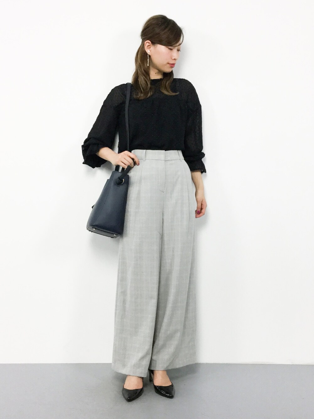 KIIのシャツ/ブラウス「ドットドビー素材スタンドカラーキャンディースリーブギャザープチハイネック長袖シフォンブラウス」を使ったコーディネート