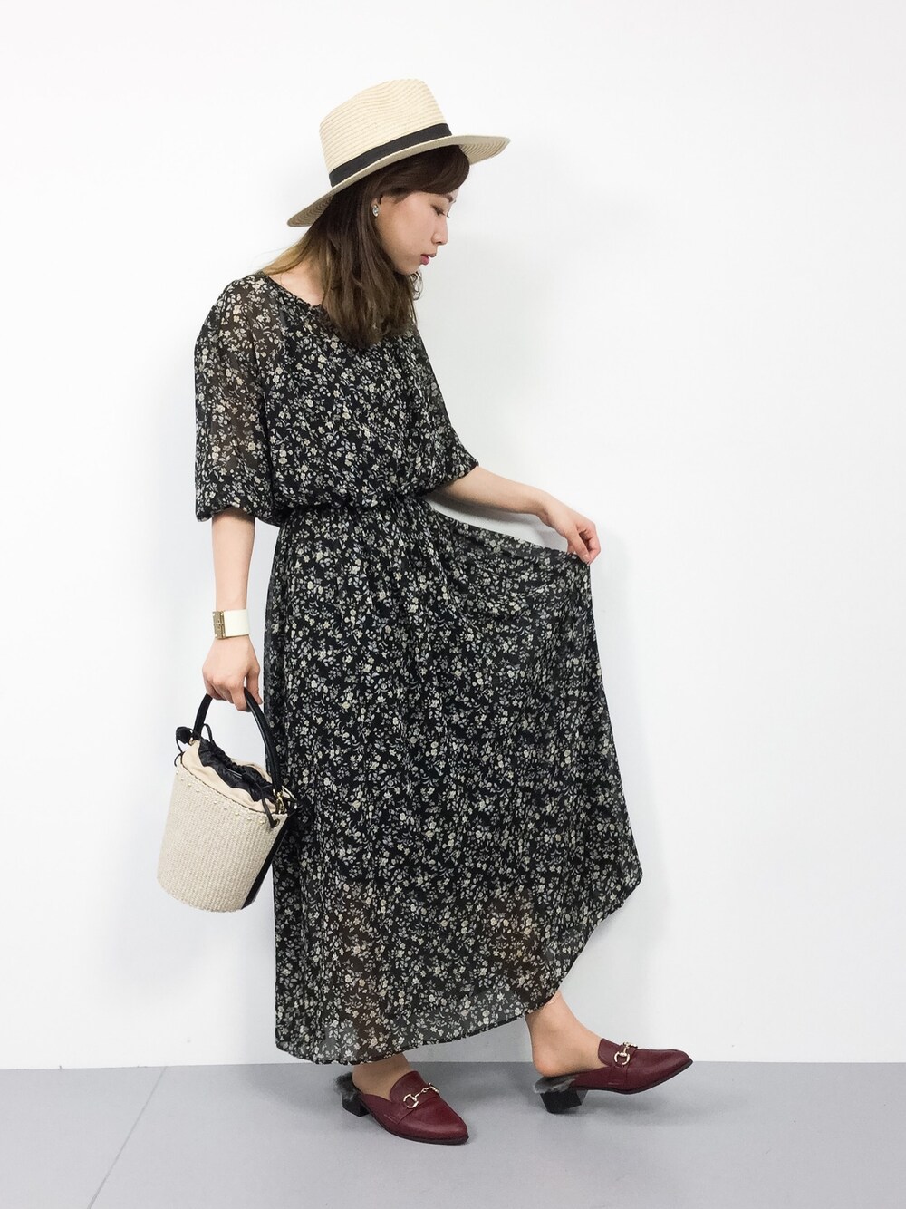 ゆったりサラっとしたワンピースは今年の マストアイテムです😊♪ ラフなシルエットですが、透け感のある生地と とろみのある素材でガーリーに決まります✌️ バケツバッグはスタッズが付いていて ガーリーなワンピースと相性バッチリです👌♡