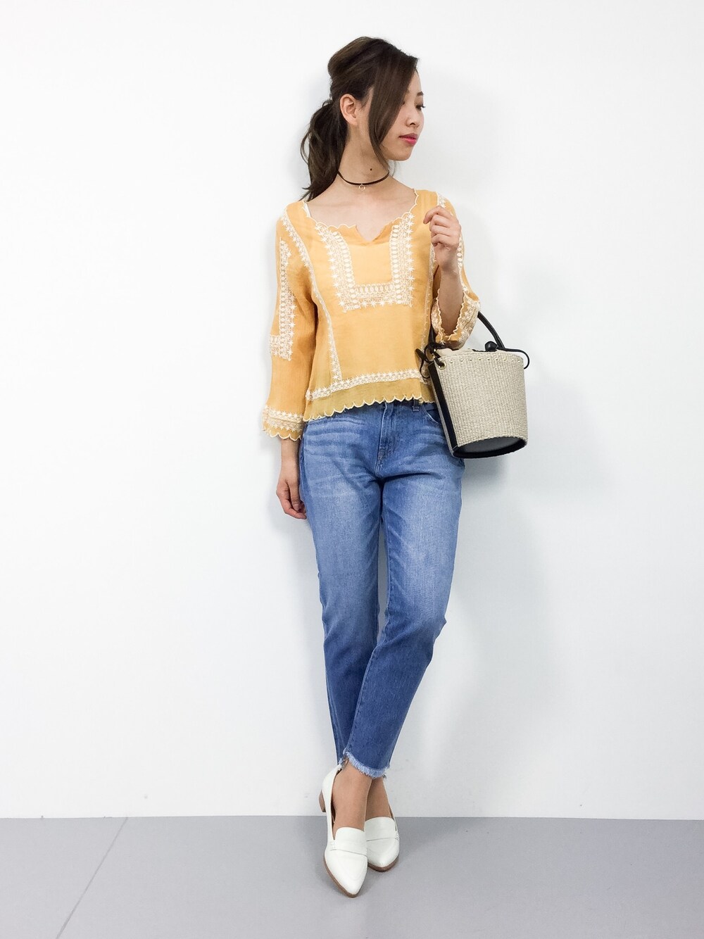 エスニックテイストのトップスはコーデに 取り入れるだけで夏らしくなりますね♪ サラっとした生地で快適に過ごせそうです! ラフなデニムと季節感のあるバケツバッグで カジュアル夏コーデです!