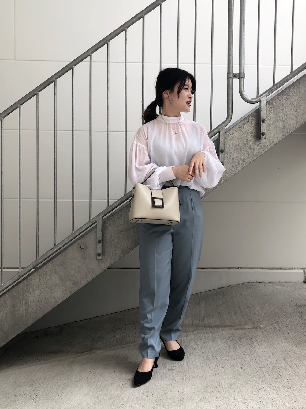 シアー素材のトップスにテーラードパンツでキレイめコーデです。 袖にボリュームがあって女性らしいデザインになっていますよ!