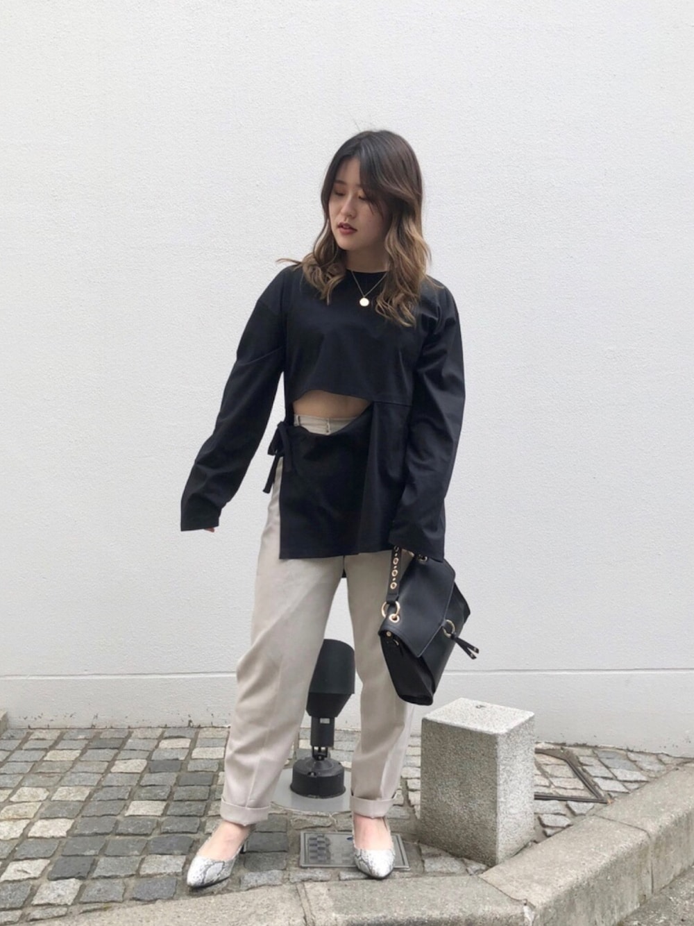 ウエストが大きくカットされたトップスに、テックリネンパンツを合わせてカジュアルダウンしました! トップスは前後逆に着られたり、中のインナーを変えたりでかなり着回しができます💕