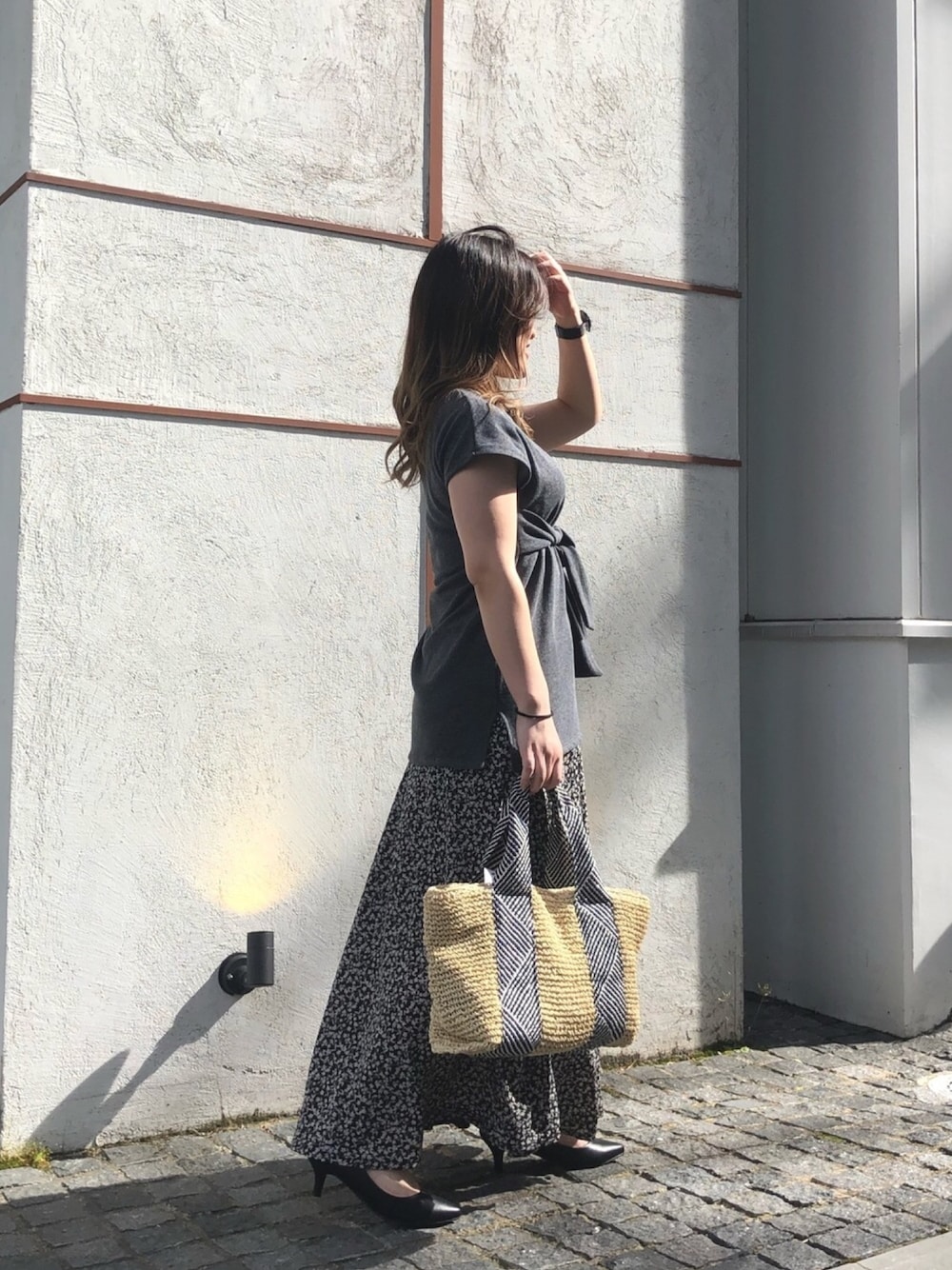 ウエストリボンが特徴のトップスに花柄スカートを合わせました! トップスはストレッチが効く素材なんですが、高めの位置にあるウエストリボンがほっそりと見せてくれるのでスタイルアップになりますよ✨