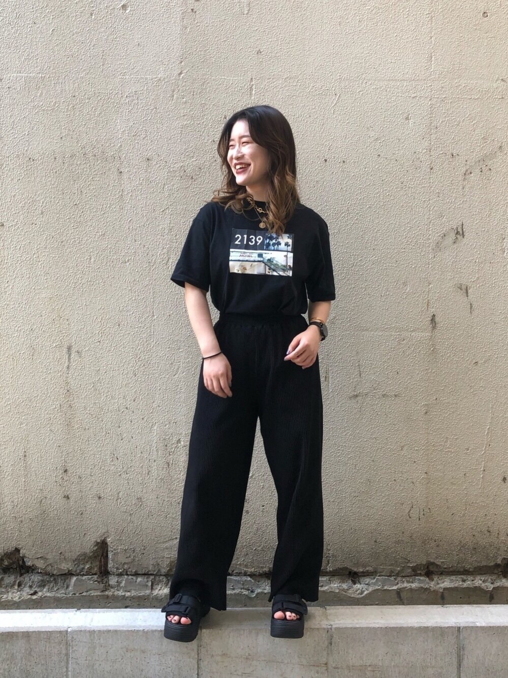 リブパンツにロゴTシャツのオールブラックコーデです! シンプルだからこそ大きめロゴが映えるのがポイントです😊