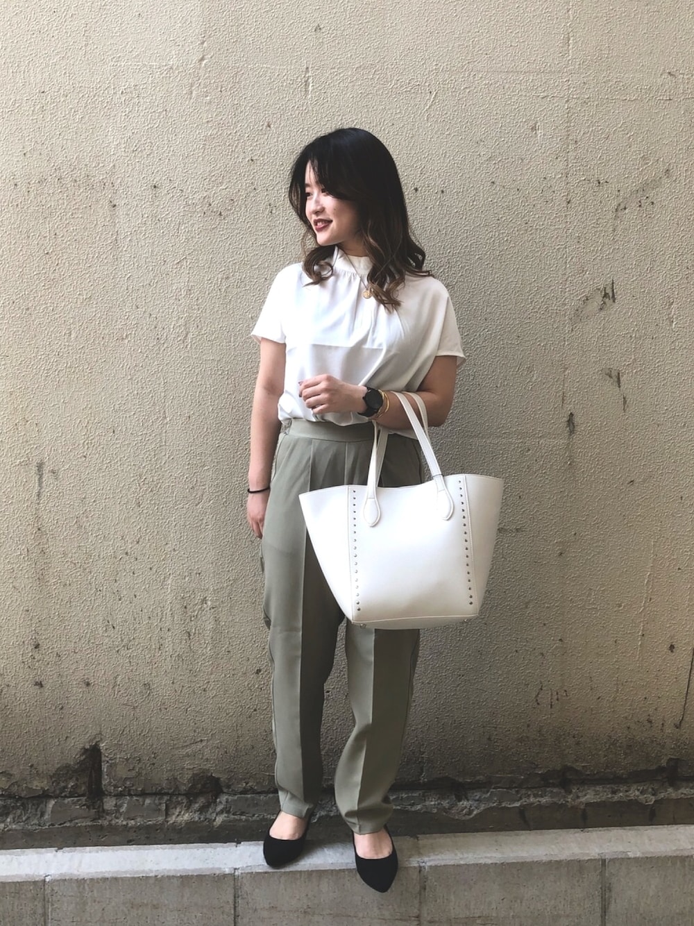 綺麗めカジュアルオフィスコーデです! プチハイネックになっているツルッとした素材のブラウスがとっても着心地がいいですよ😊