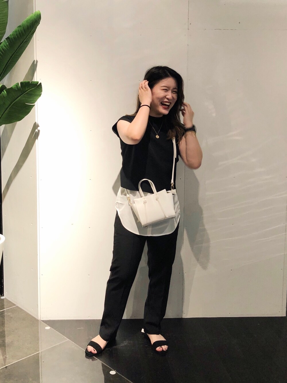 モノトーンコーデです! トップスはニットとフェイクシャツがセットになっていて、トレンドのレイヤードスタイルが簡単にできますよー!