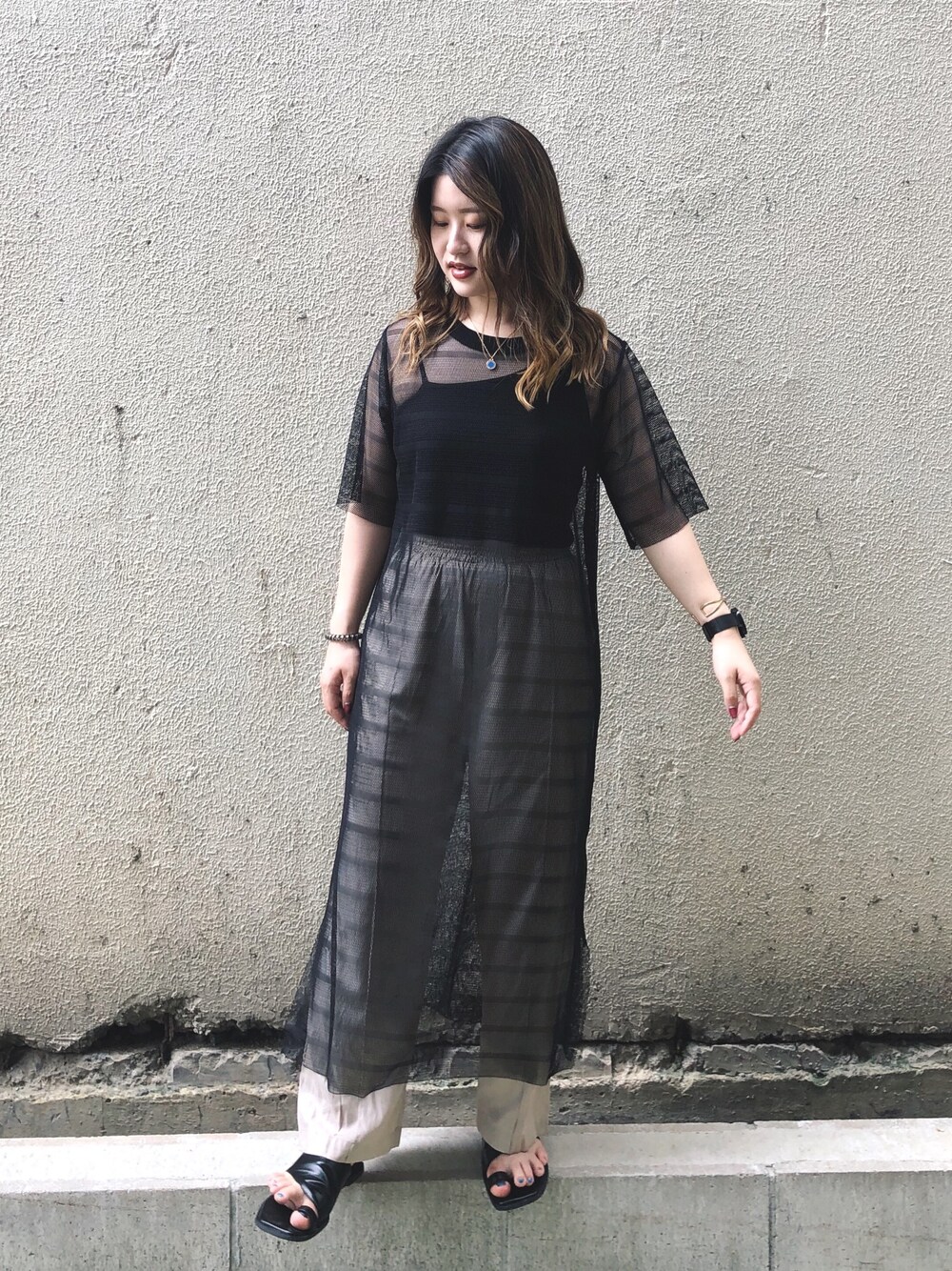 メッシュワンピの下にアシメトップスとワイドパンツを合わせました! シンプルだけどちょっと個性的なスタイルが好きな方にオススメですよー!