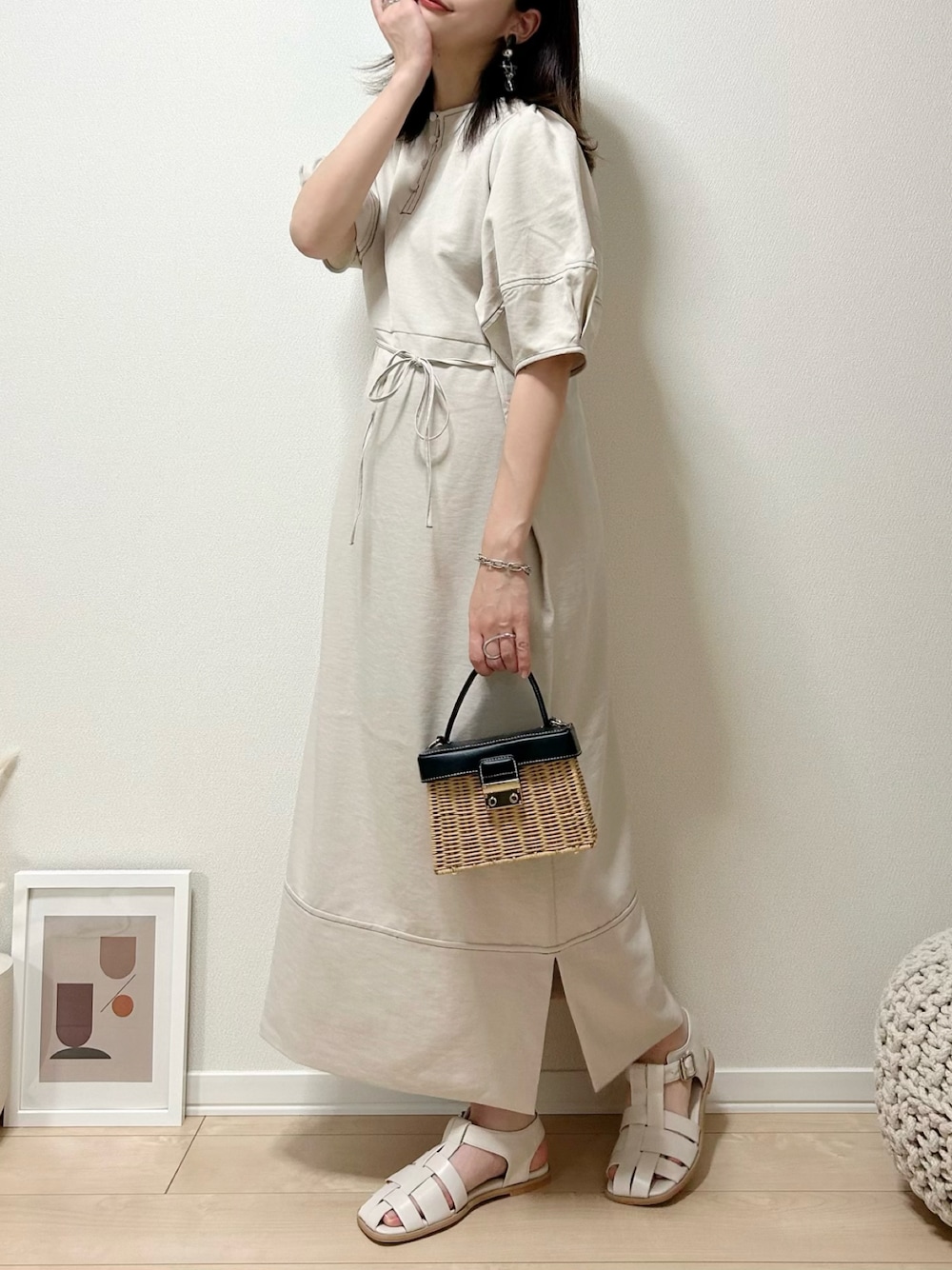 だぶるのワンピース「自然体で1枚さらり。春夏 使える 前後2way 配色ステッチランタンスリーブワンピース」を使ったコーディネート