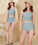 ワンショルダーの水着はサイドのタックが◎ ハイウエストのスラックスとスカーフで 洗練された雰囲気をアピール💎
