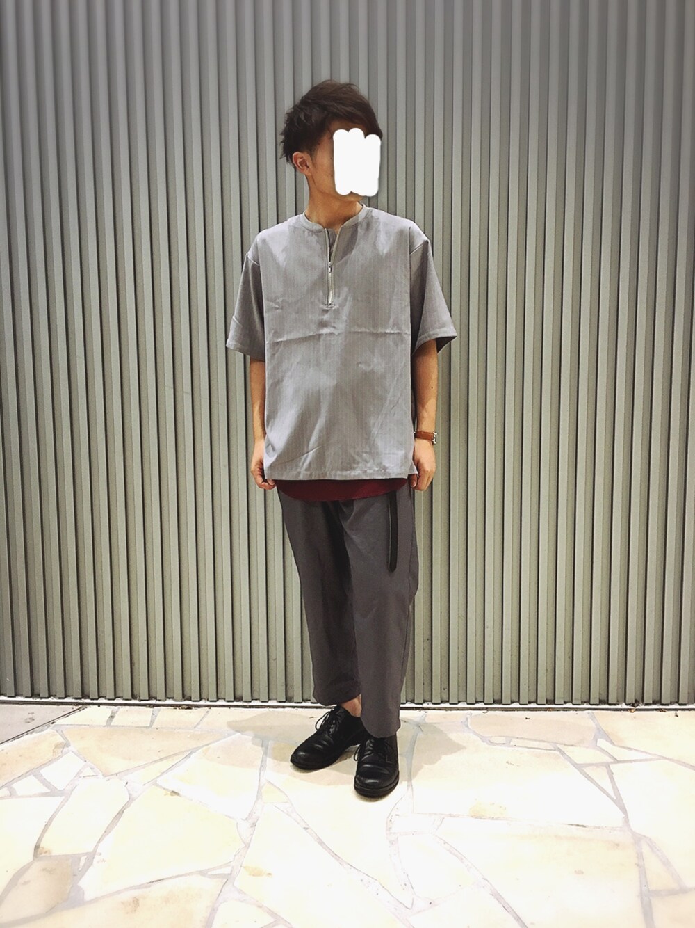 今回はレイヤードコーデです!✨✨ 全体的にグレーで合わして差し色で赤色をいれてみました!✌😊 ベルトと靴を黒色にすることによって落ち着いた雰囲気になりました♪