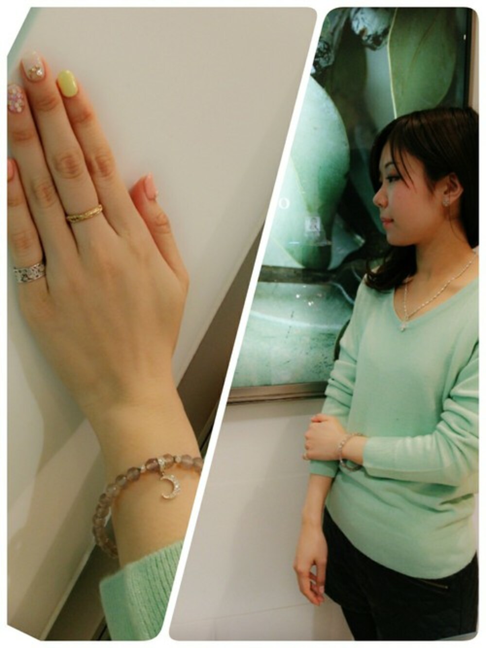 透明感のある天然石ブレスと透かしデザインのリングの組み合わせで腕回りを軽やかな雰囲気に。 胸元はプリンセスクロスで上品ながらボリュームを出しました。