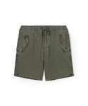 〈JAMES PERSE〉コットンヘンプショーツは独特な風合いと軽さのある素材感が魅力。 柔らかなスエード素材を使用したリュクスなサンダルと合わせてカジュアルながら上品さも取り入れたスタイリングに。