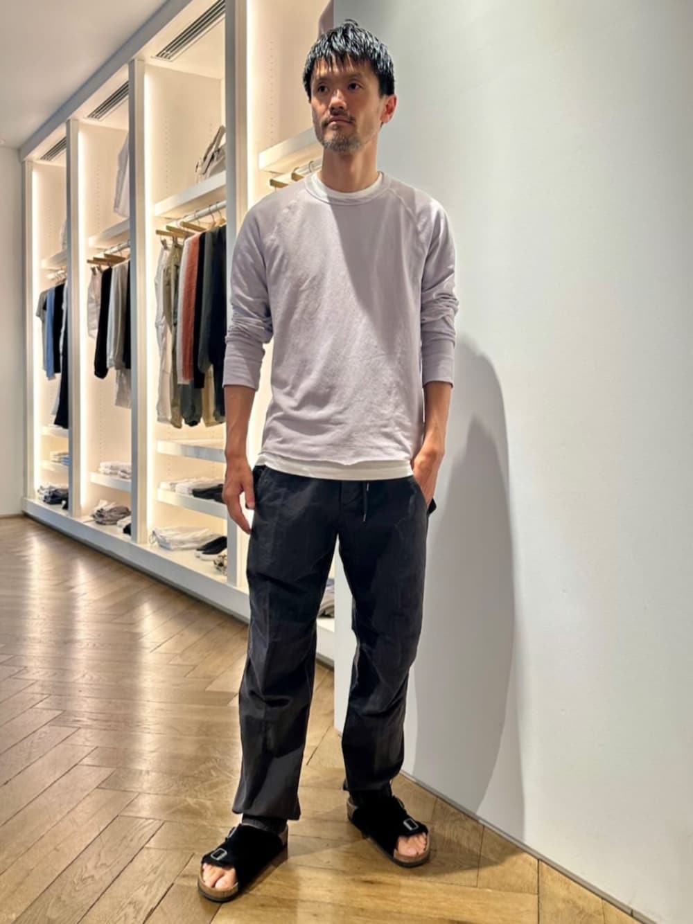 〈JAMES PERSE〉ブラッシュドコットンジャージーカットソー。 伸縮性、軽量感のある素材は夏の長袖としても活躍いただけます。 切りっぱなしのデザインも特徴。