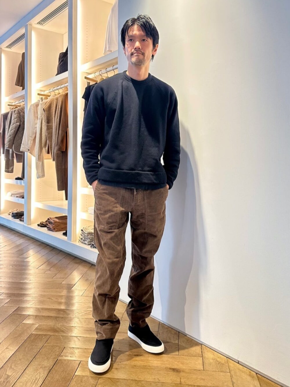 〈JAMES PERSE〉コーデュロイイージーパンツは深みのあるブラウンカラーがアクセントに。