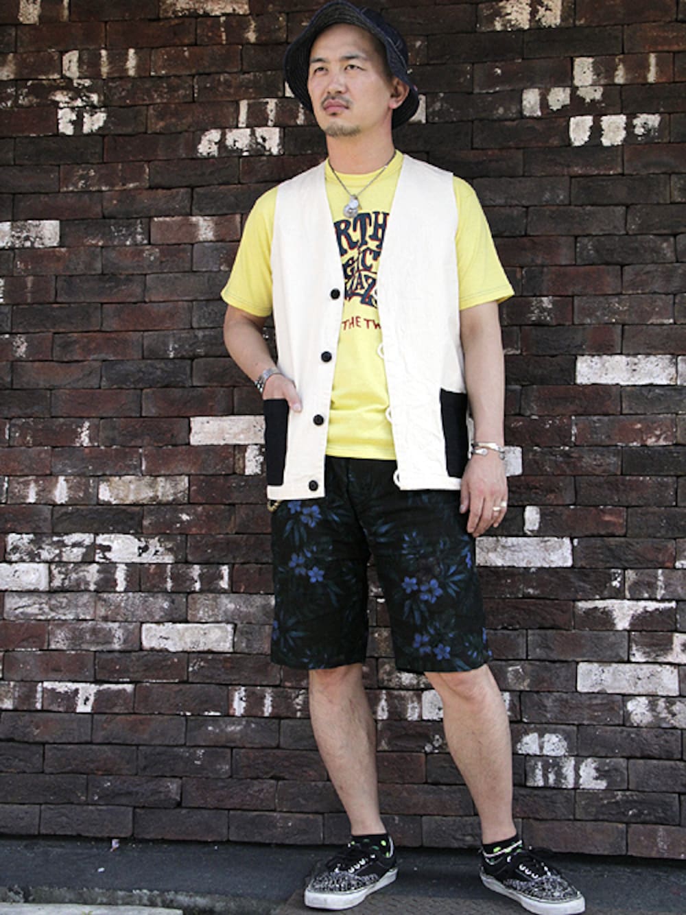 夏らしくプリペラ生地にトロピカルな柄をプリントしたハーフパンツに、イエローのロゴ入りTEEとベストを組み合わせたアメカジ・コーディネートです。
