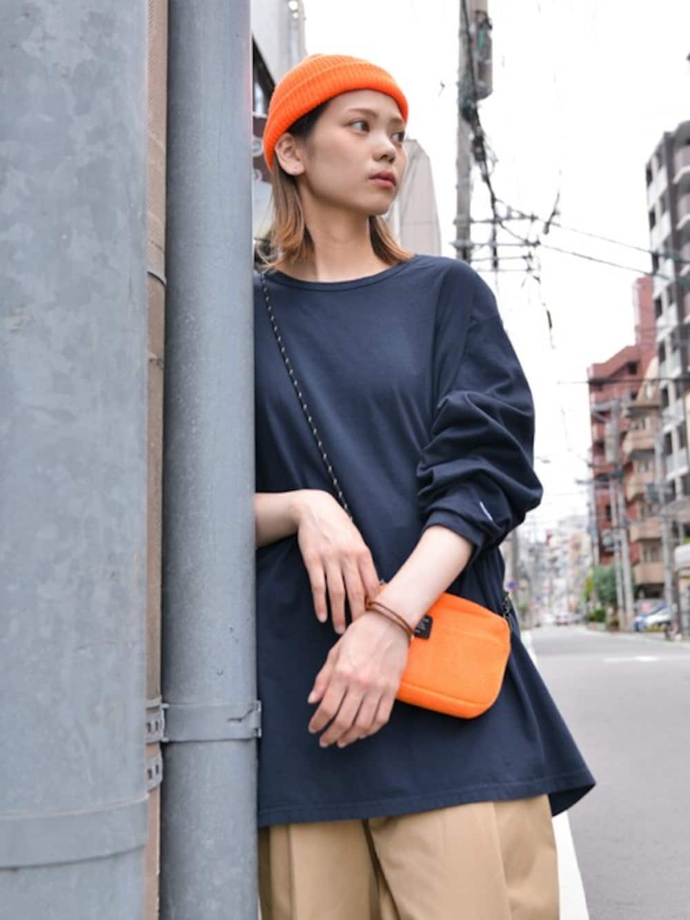 ライトオンスのチャンピオンのロングTは 着こなしによっては春夏秋冬4シーズンに対応できますので シンプルなスタイルが好きな方におススメです! 今回はネイビーをチョイス。 ニット帽とウエストポーチがオレンジで差し色に。