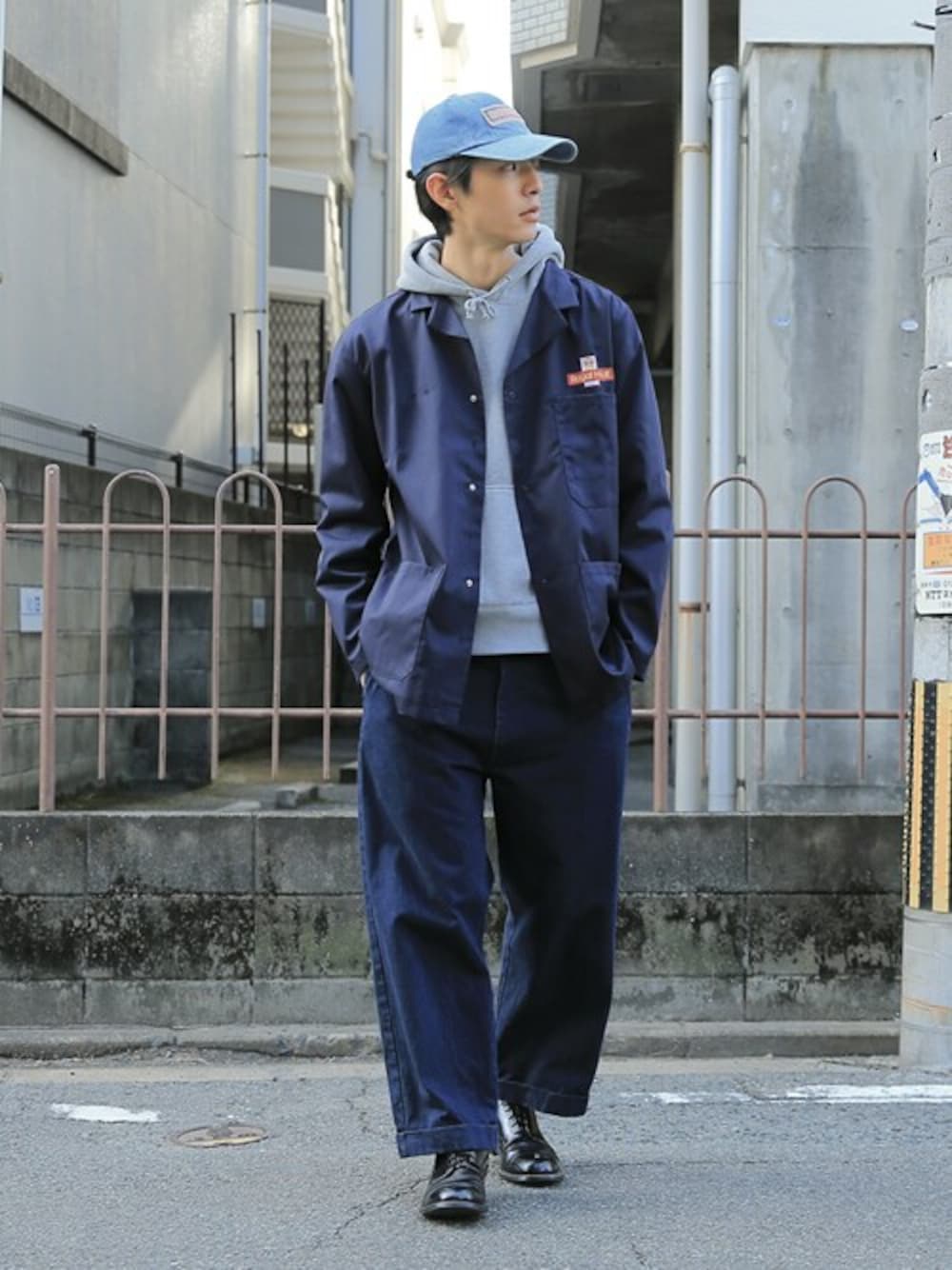 ネイビーのワントーンコーデです。 パーカーにジャケットスタイルはもはや王道ですね! カッコいいスタイルです! Royal Mailの郵便配達員が実際に着用しているワークジャケットが未使用デッドストックで入荷です。