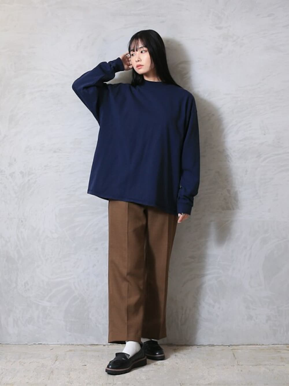 今回は大きいシルエットのtシャツにキレイめのパンツでシンプルにコーデ組みました! ネイビーとブラウンの合わせがいいですよね!