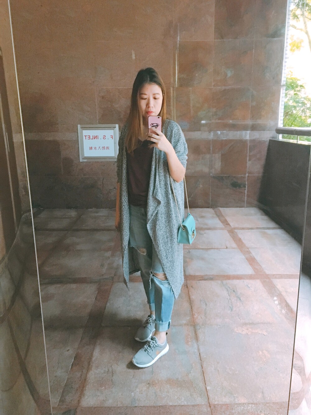 ブルー系のデニムパンツ、その他のメッセンジャーバッグ、シルバー系のスニーカーを着用したレディースの春コーディネートの1枚目の写真