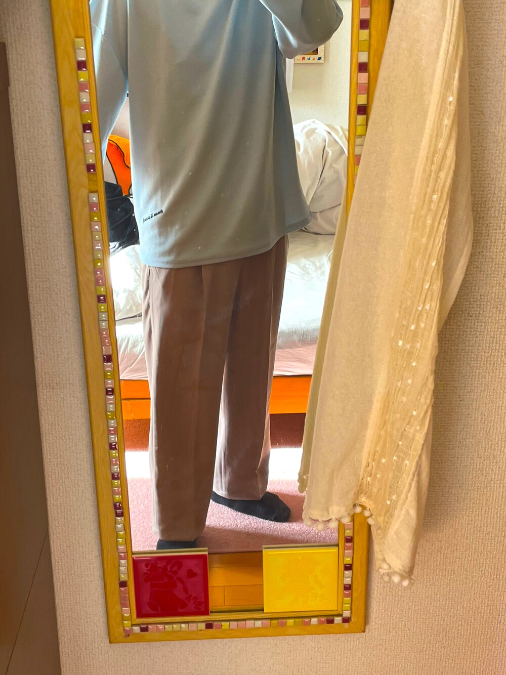 ベージュ系のスラックス、ブルー系のTシャツ/カットソーを着用したメンズの冬コーディネートの1枚目の写真