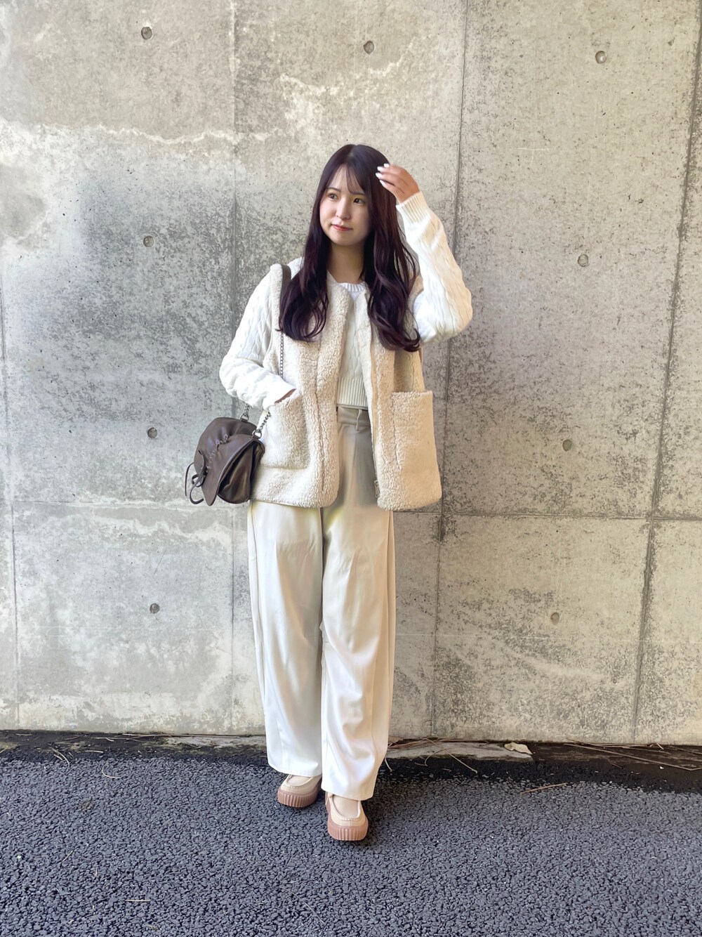 お気に入りのファーベストを使ってオールホワイトコーデしました! バッグのブラウンが差し色になって違和感なしです! Instagram▷@waka_weargrm インスタも見に来て下さい♡