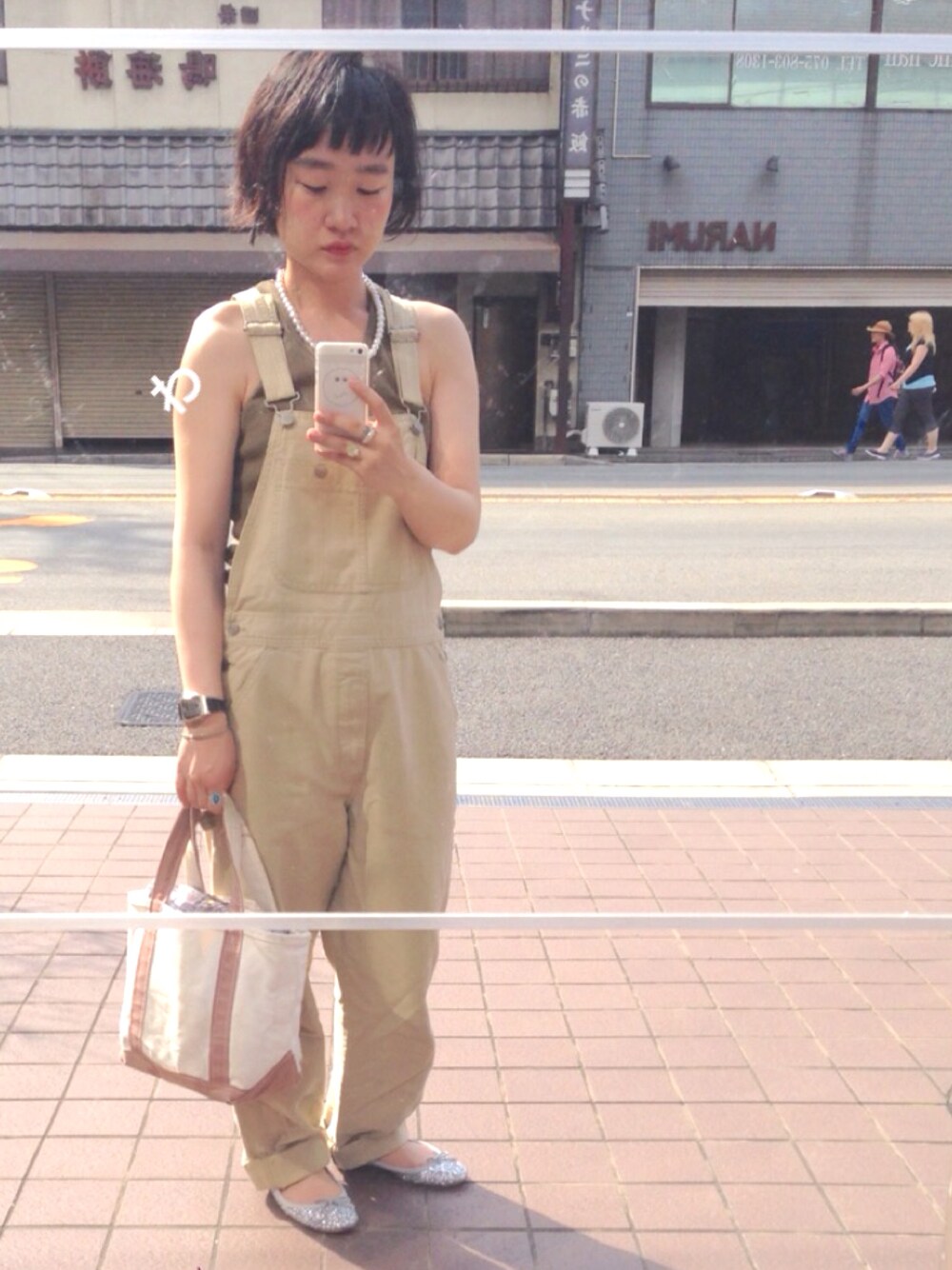 古着 タンクトップ×オーバーオール 少しワイルドになってしまうので、パールとキラキラシューズ合わせました