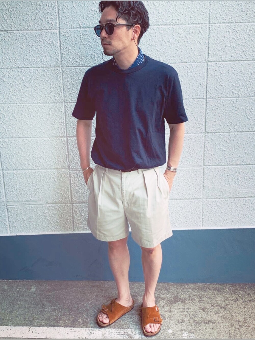 休日スタイル。 首に巻くのが気分。 ラルフローレンのショーツはタックがあるのでワイドシルエットになるのでとても気に入ってます。