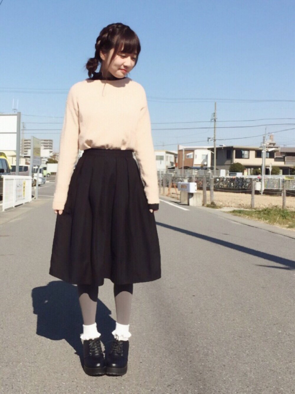 黒スカートにピンクのニットで ちょっとだけガーリーなコーデ♬ 金ピンつけるために編み込みも 頑張りました (﹡ˆoˆ﹡)♡ ピンク着ると春が恋しくなる😭💕 アウターは黒のブルゾン*\(^o^)/*