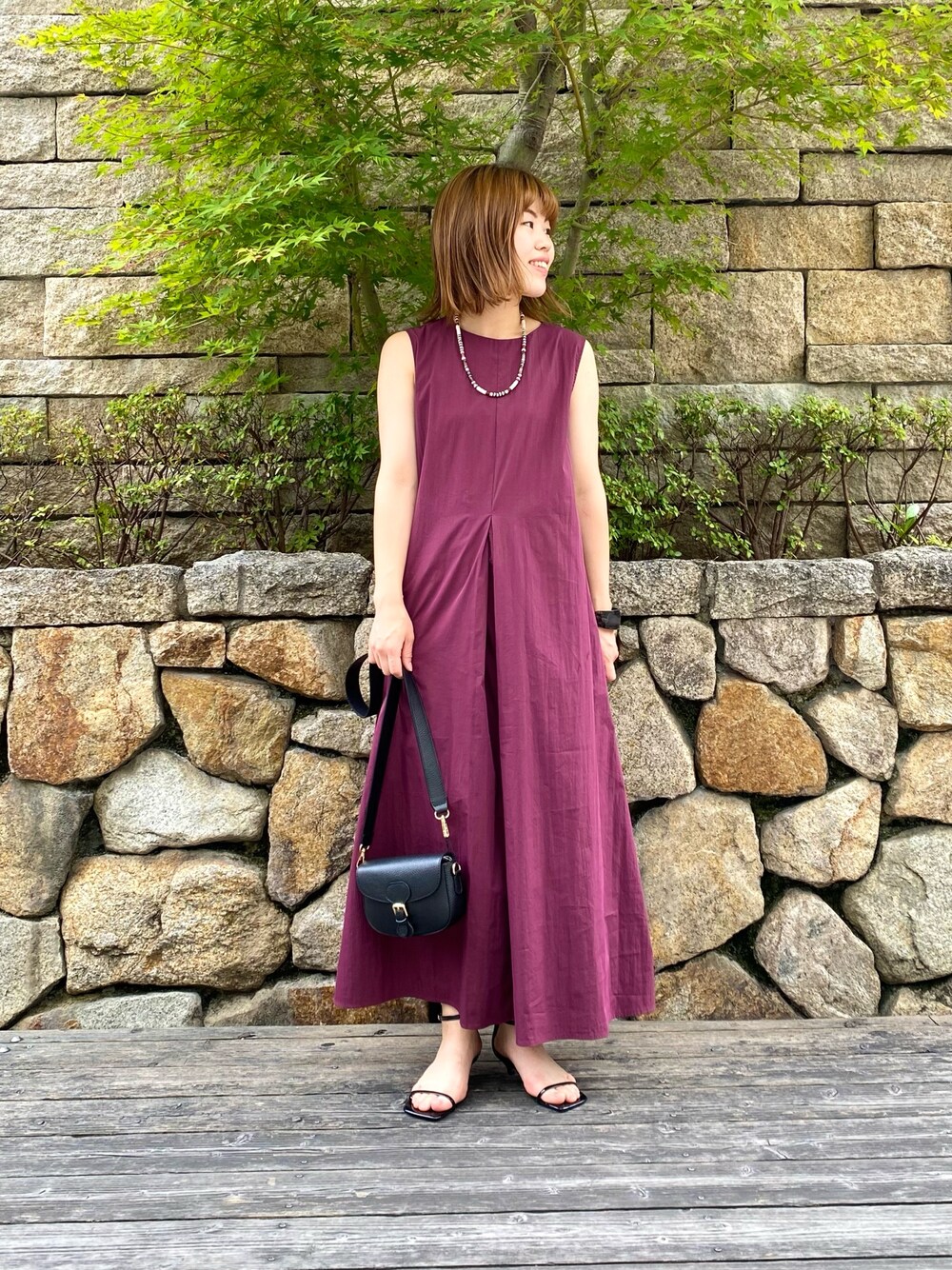 綿ナイロンタックテントワンピースは Aラインのシルエットが綺麗です。 BURGUNDYは透け感も無く、 一着でさらっと着用出来ます。 いつもと印象を変えたい方、 カラーものに挑戦してみたい方にもお勧めです。 ナローストラップサンダルは 普段23.5cmで37サイズがジャストサイズでした。 細めのストラップが足を華奢に見せてくれ、 低めのヒールで歩きやすかったです🌟 コーディネートが参考になれば嬉しいです♪ お気に入り登録とフォローもお願いします🍬