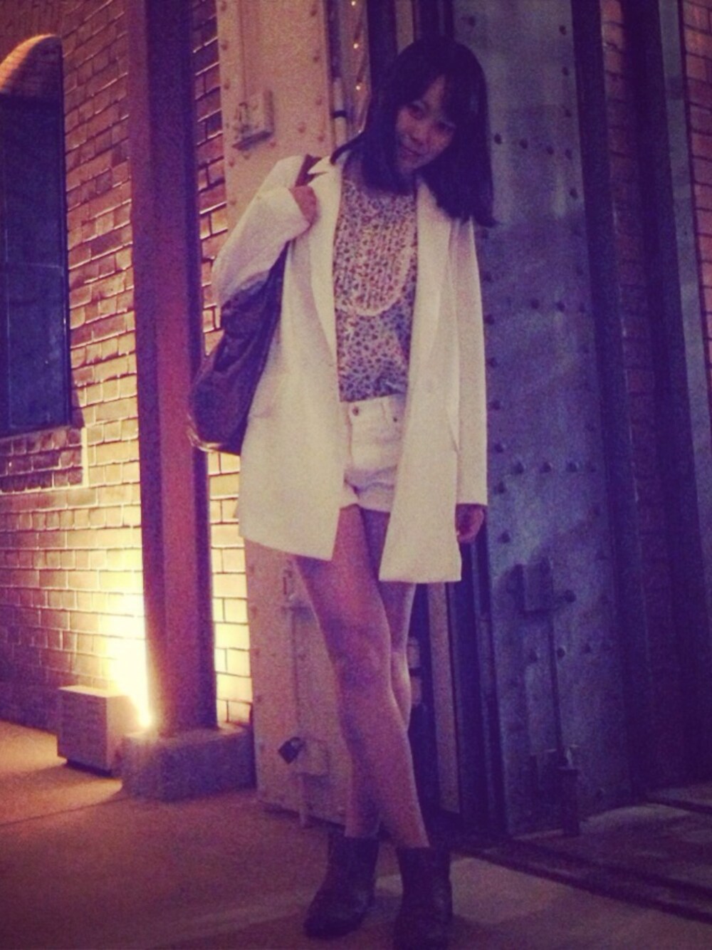 ホワイト系のテーラードジャケットを着用したレディースの春コーディネートの1枚目の写真