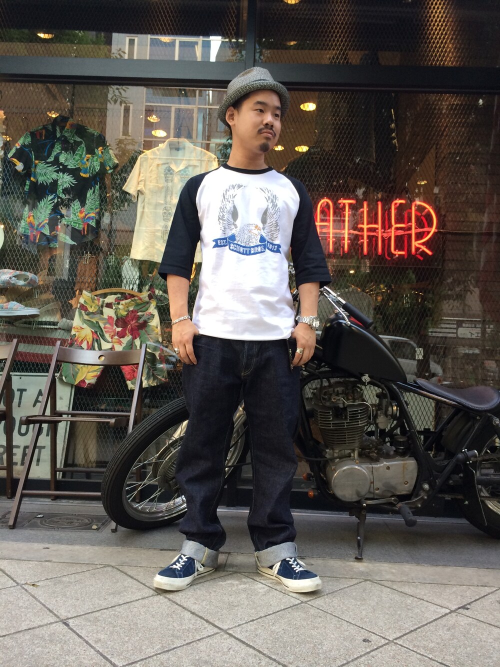 イーグルのプリントがされたラグランTは太めのデニムで合わせました。