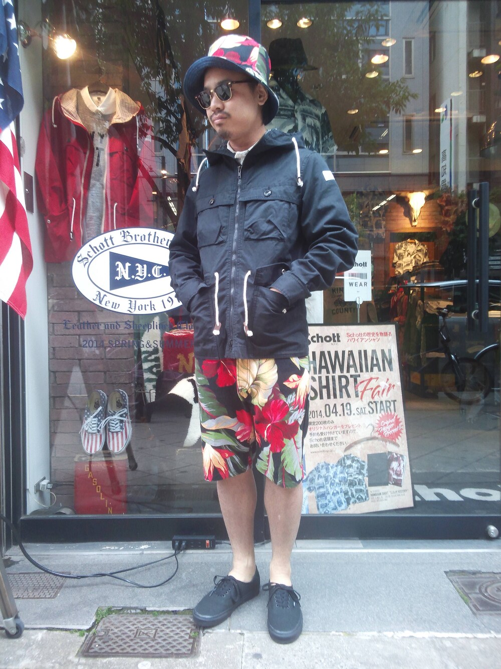 ハワイアンな雰囲気のショーツとハットで合わせて、他をシンプルにまとめました。