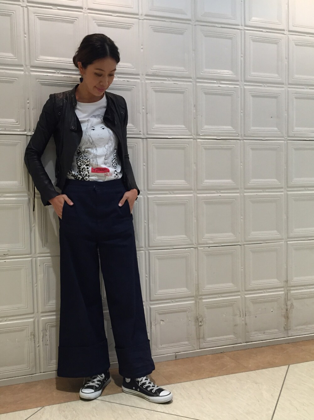 ワイドパンツにコンパクトなライダースを合わせてバランス良くしました☻