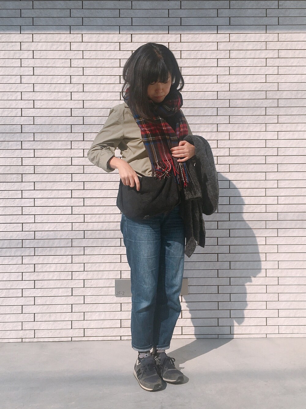 minaのストール/ショール「Check Stole」を使ったコーディネート