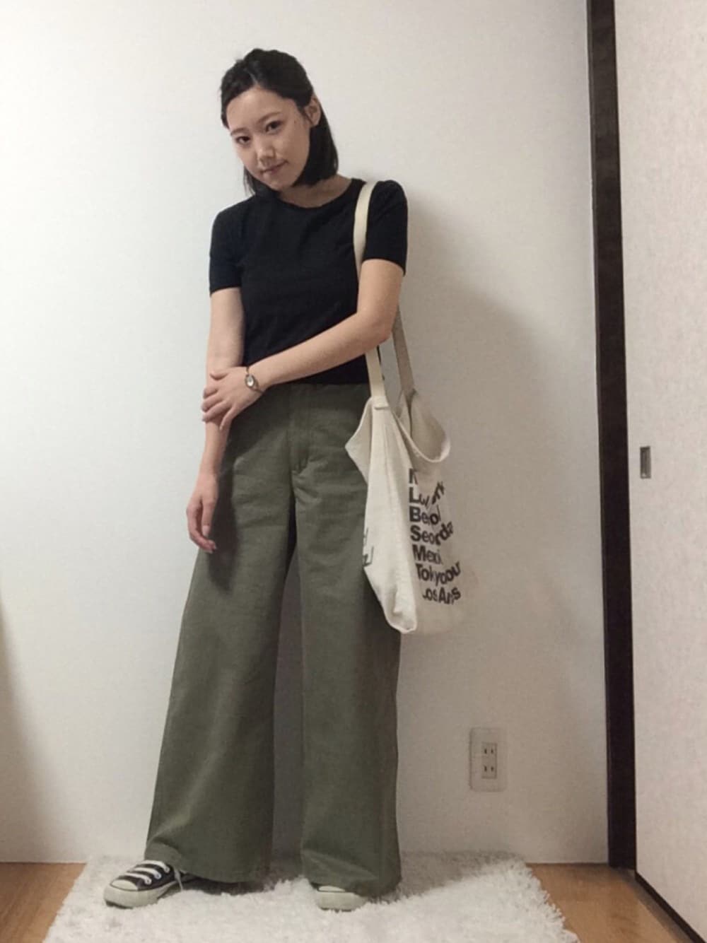GUでセールだった チノワイドパンツ💘 最近カーキだらけです。。 アメアパのバッグは何でも合うから 長く愛用しています🙈💭