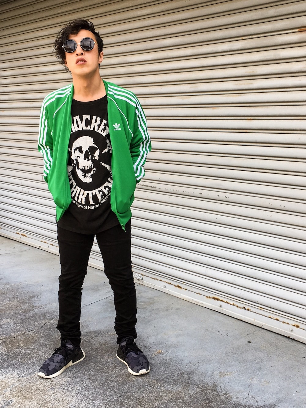 アディダスのジャージとブラックスキニー この組み合わせ最高に好き!! (襟織り込まれ気味ですが) サングラスもラウンドグラス 音楽とファッションはお互いを助け合う