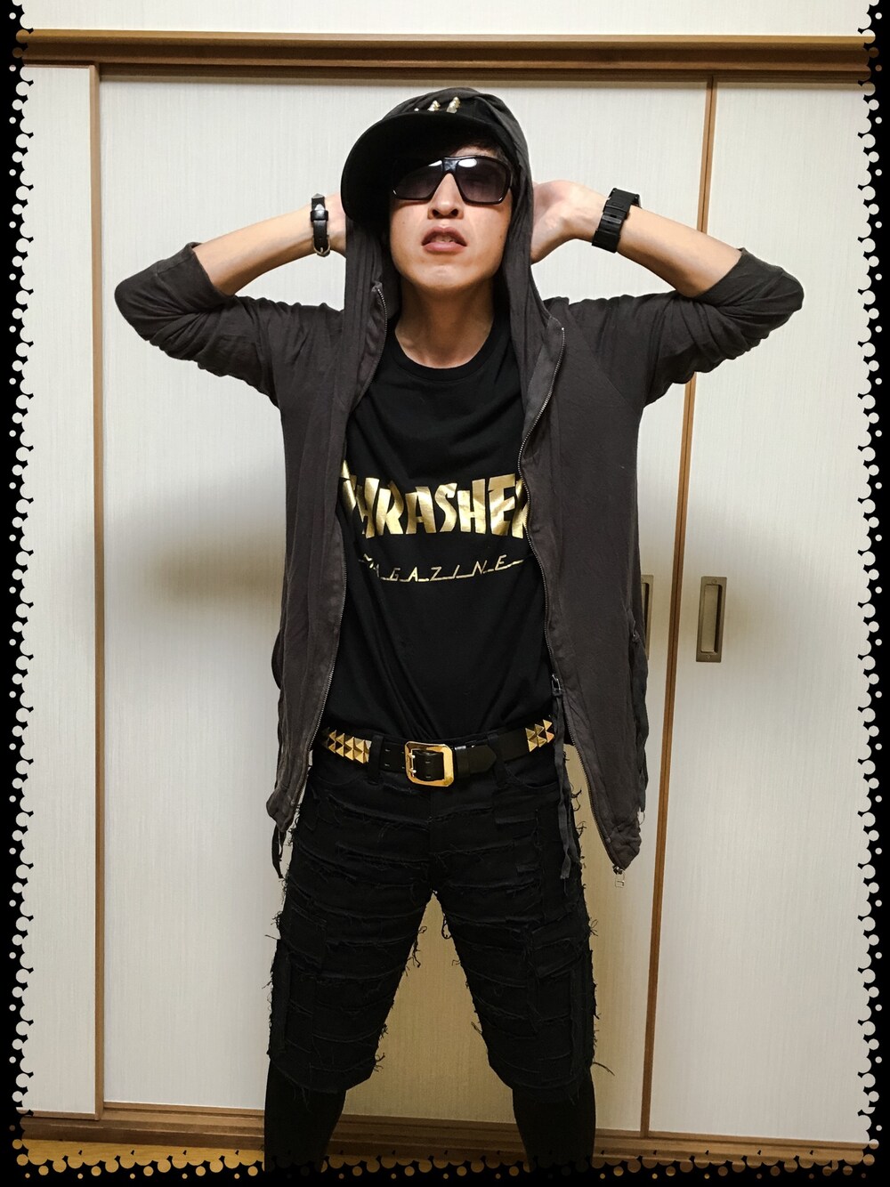 今日は得意のロック&パンクコーデ!! やはりブラックトーンですw クラストパンツにビッグTシャツイン。 スタッズキャップに薄手のパーカー被ってみました。 ベルト見せでハードめです。 ポーズは尊敬する人の中の一人。 その方の真似です。(やってみたかったのです) ちなみに室内での撮影なので靴は写ってないです。 GGDのいつものやつですね。 音楽とファッションはお互いを助け合う