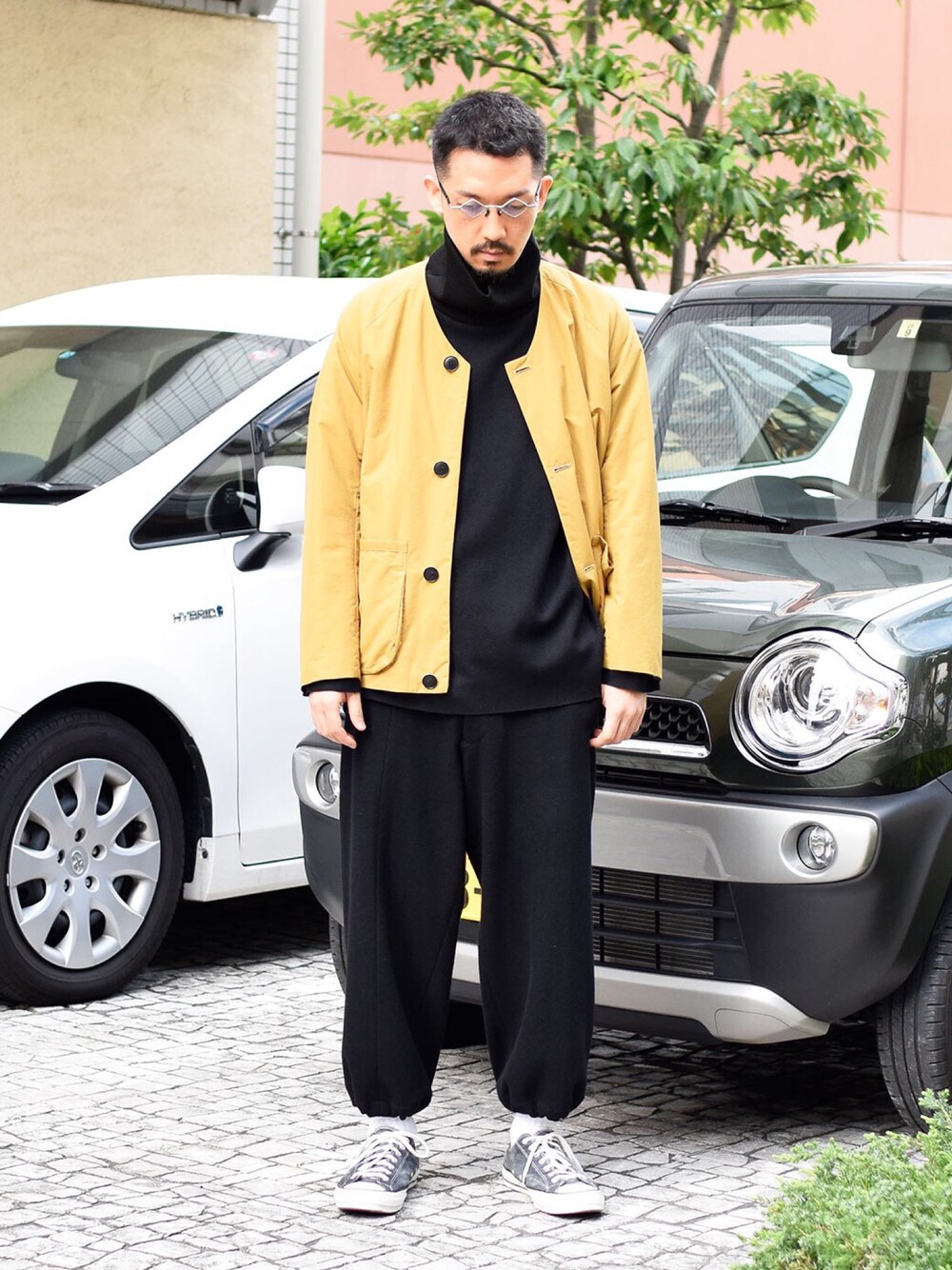 Tops : my beautiful landlet - nylon taffeta padding jacket Inner : my beautiful landlet - cashmere wool high‐necked sweater Pants : my beautiful landlet - cashmere wool wide pants Eye wear : KUBORAUM - Maske Z12