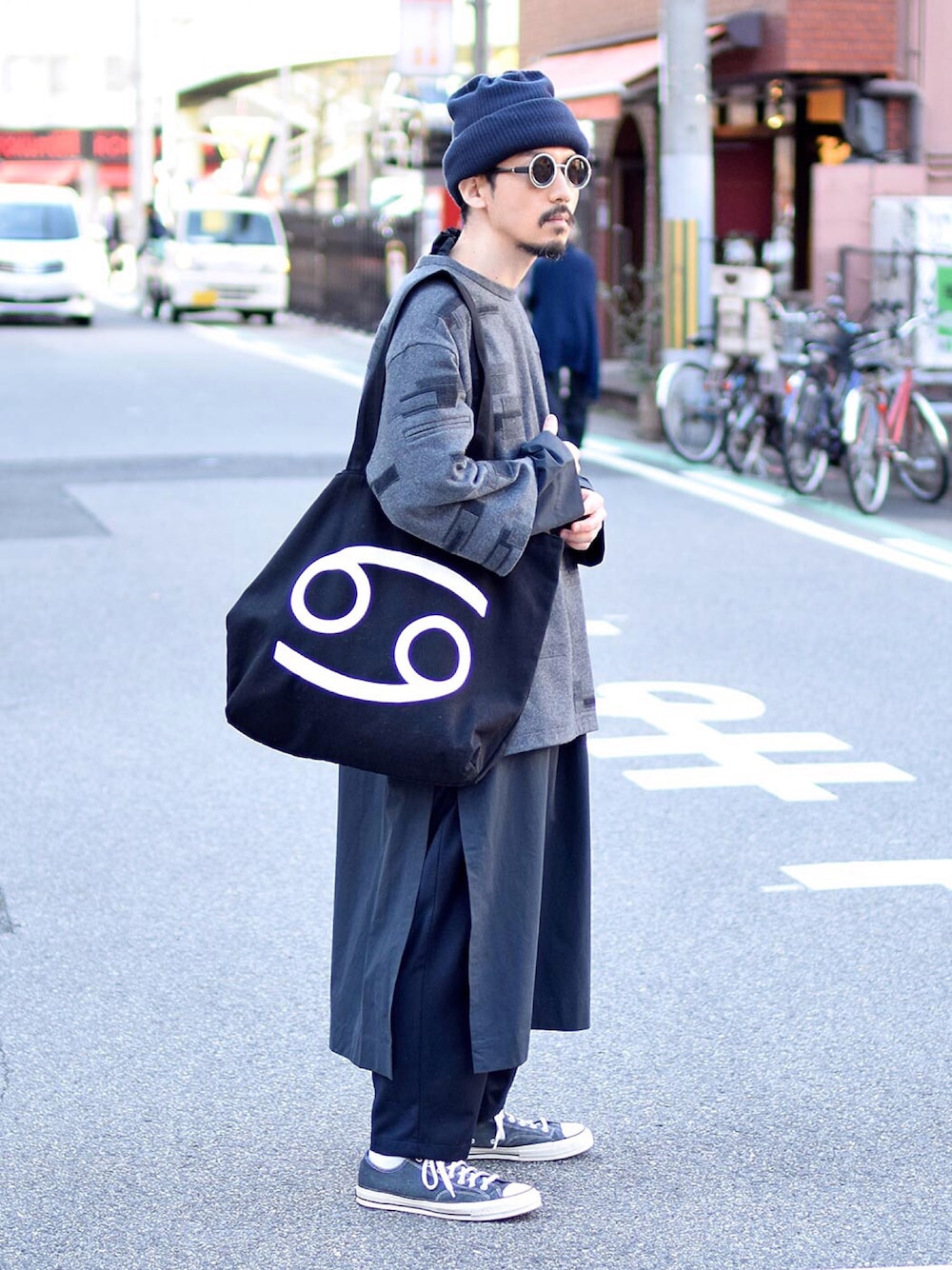 Tops : MAREUNROL'S - T-shirt grey birch Inner : CRAIG GREEN - long v-neck top Pants : HED MAYNER - 2pleats pants Hat : Edwina Horl - rib knit watch cap Eyewear : KUBORAUM - mask Z3 Bag : 69 - tote bag Shoes : CONVERSE - first string chuck taylor