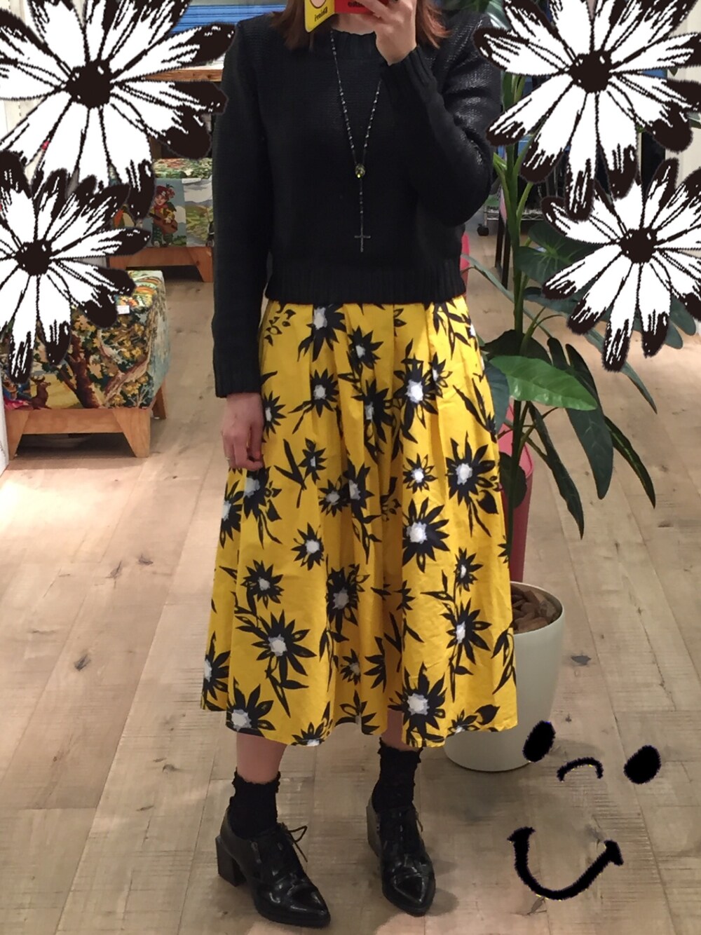 H&Mのレザー風ニットを、大きな花柄が目立つスカートと一緒に☆