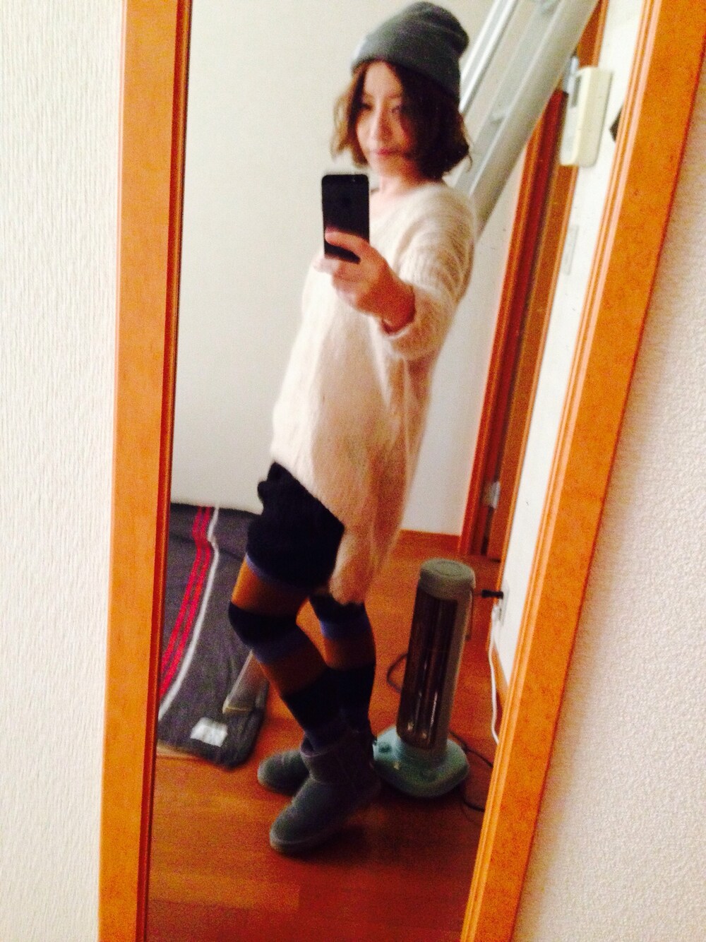 モヘアロングビッグニットと黒ケーブル編みかぼちゃニットパンツ。ウールタイツで足もあったか