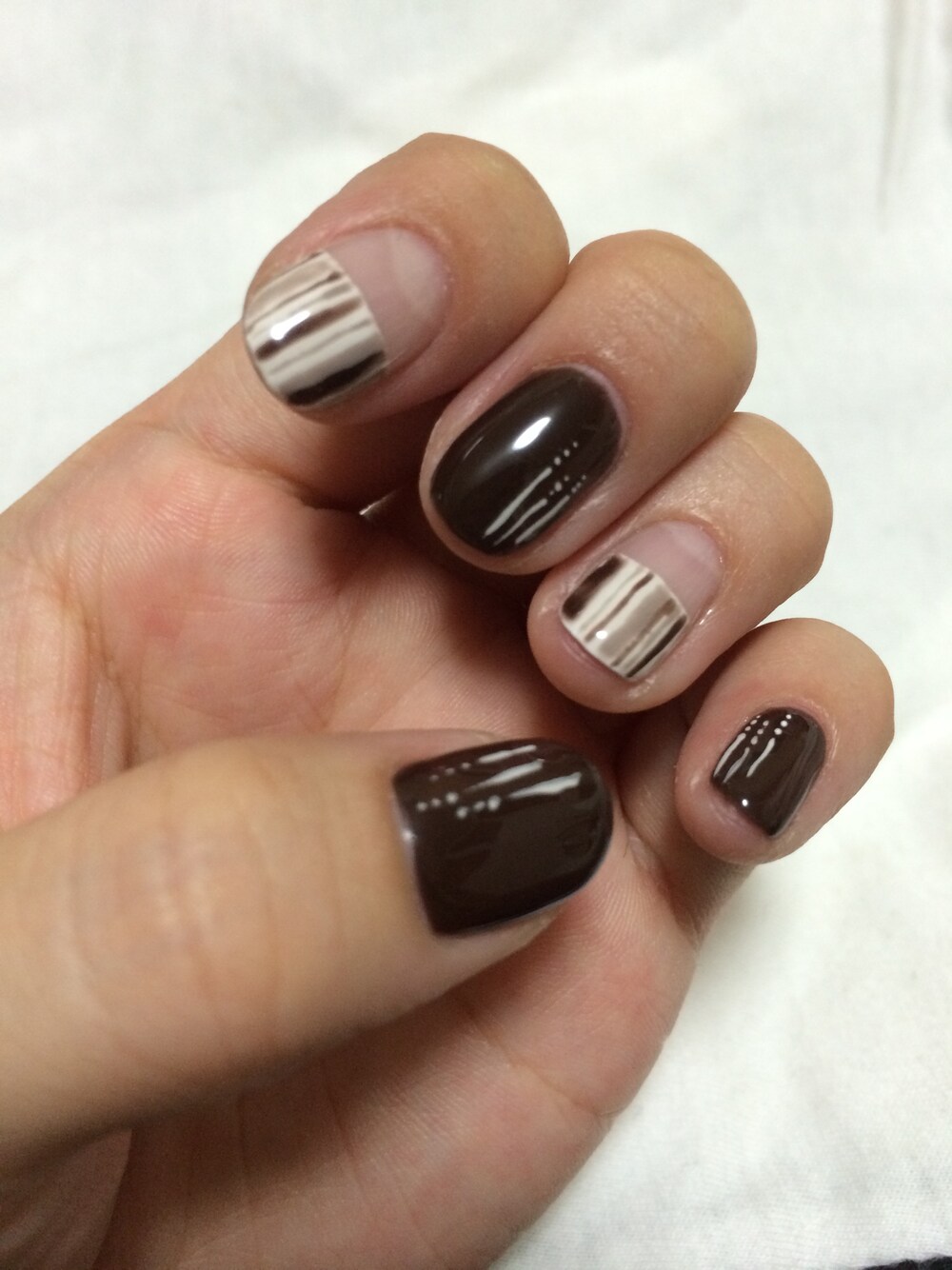 セルフネイル:*) 寒いからカフェオレ飲むのにコーヒーにミルク入れた時にぱっと浮かんだネイル。 少しFUDGEネイルブックに載っていたのを少し参考にさせてもらいました!! 秋だしやっぱブラウンだね!!