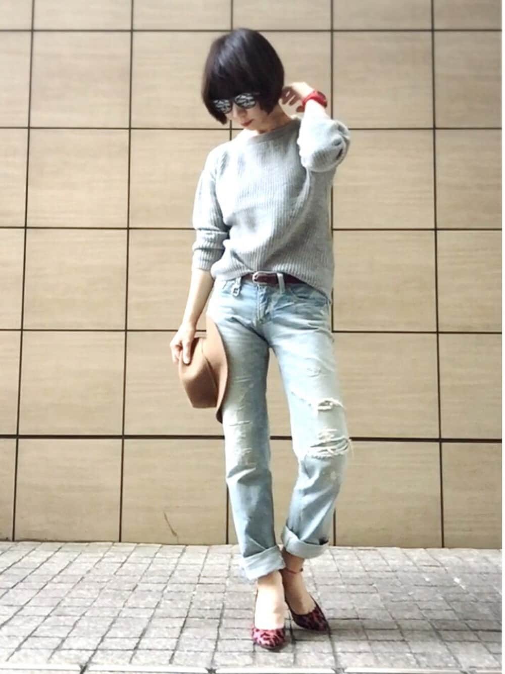 ガラガラ声は良くなりました😊 元気に仕事しました🏃 ラフなコーデだけど、グレー&ライトブルーは清々しくて落ち着く😊 グレーニットにクラッシュデニム、 おNEWのカモフラ柄のサングラス、 パンプスはピンク色➕時計、ベルトを赤色系で色合わせしました💖 なんてことないコーデでごめんなさい🙇