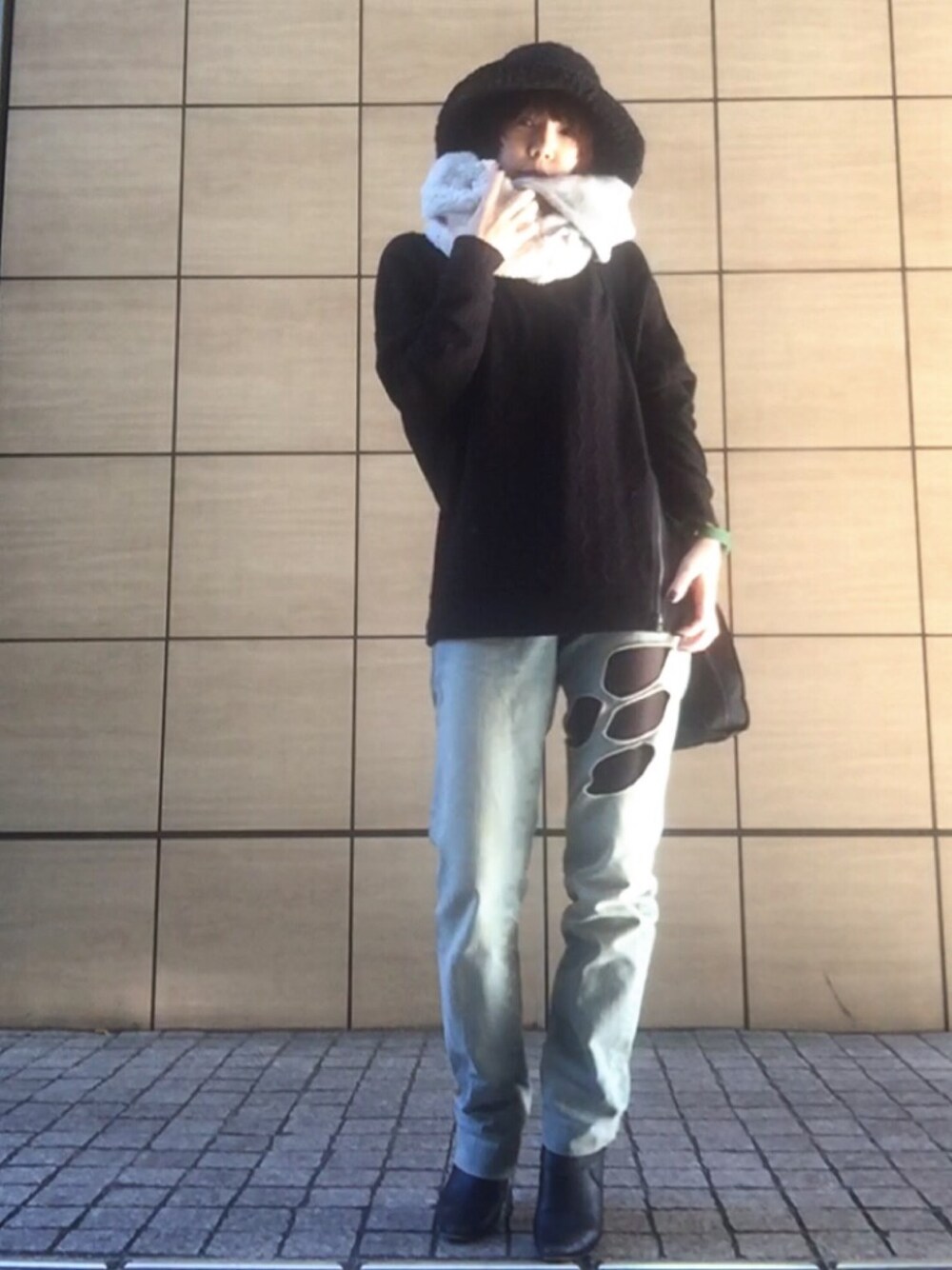 モノトーン攻めしました😊 TROVEのボリュームたっぷりのスヌード。 SHAREEFのトップスは左にだけジッパー N-Hollywoodのデニムは相方御用達の品で穴から黒いタイツ見せ Marono Brahnikは革にベルトでヒール高い こんな感じです🐊 昨日の返信終わるまで待ってね😊うっかり寝落ちする癖ができてしまったの😭😰